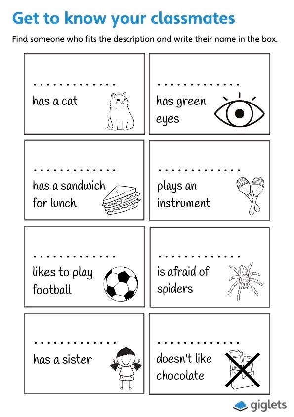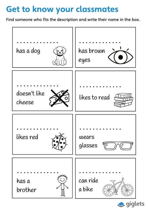 Children can take one of the activity sheets (or both if you want the activity to run longer) and must find a classmate who matches the description.