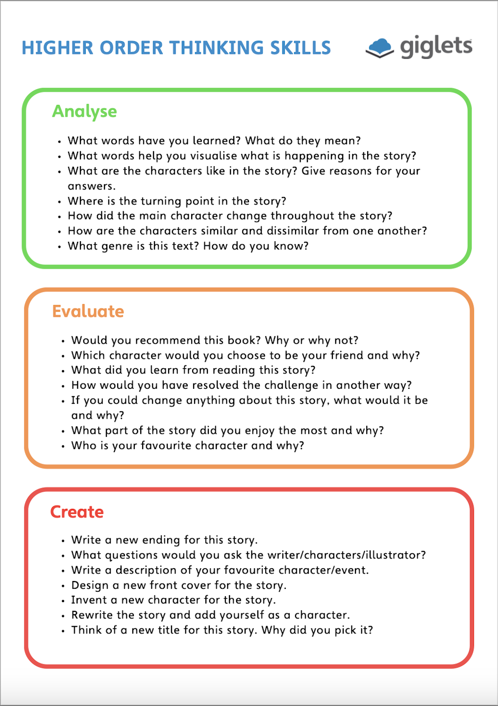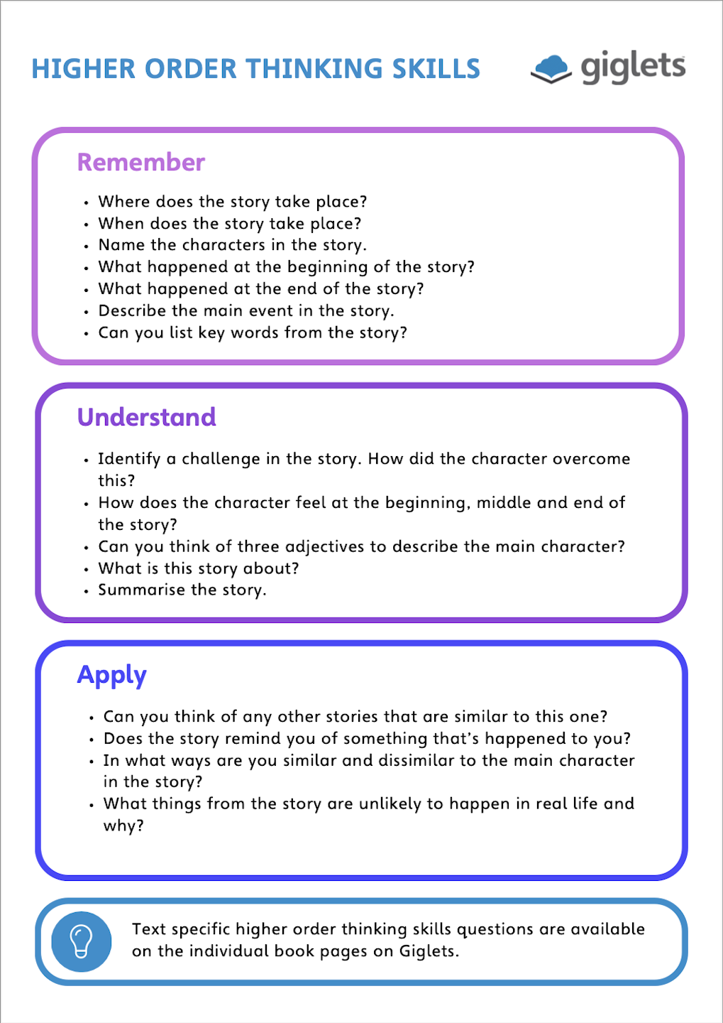 Giglets provides text-specific Higher Order Thinking Skills questions. These can be assigned to individual pupil accounts within the Giglets platform, but can also be completed as a whole class or in smaller groups and used as a discussion prompt.